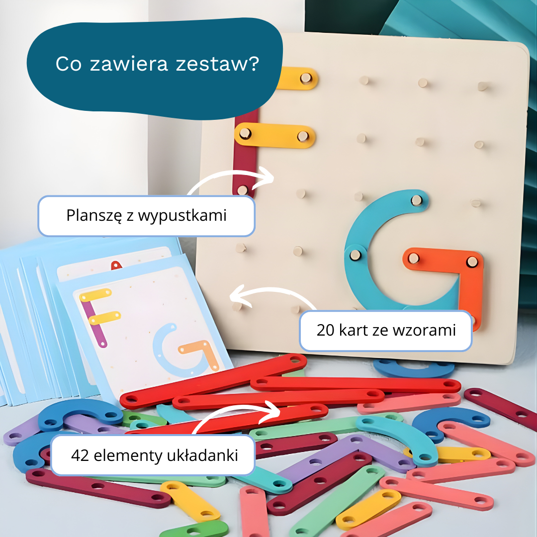 Kreatywna układanka dla dzieci, która uczy kształtów, kolorów, liter i cyfr. Dzięki kolorowym elementom i wielu wzorom maluch ćwiczy koncentrację, precyzję i wyobraźnię poprzez angażującą zabawę.