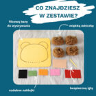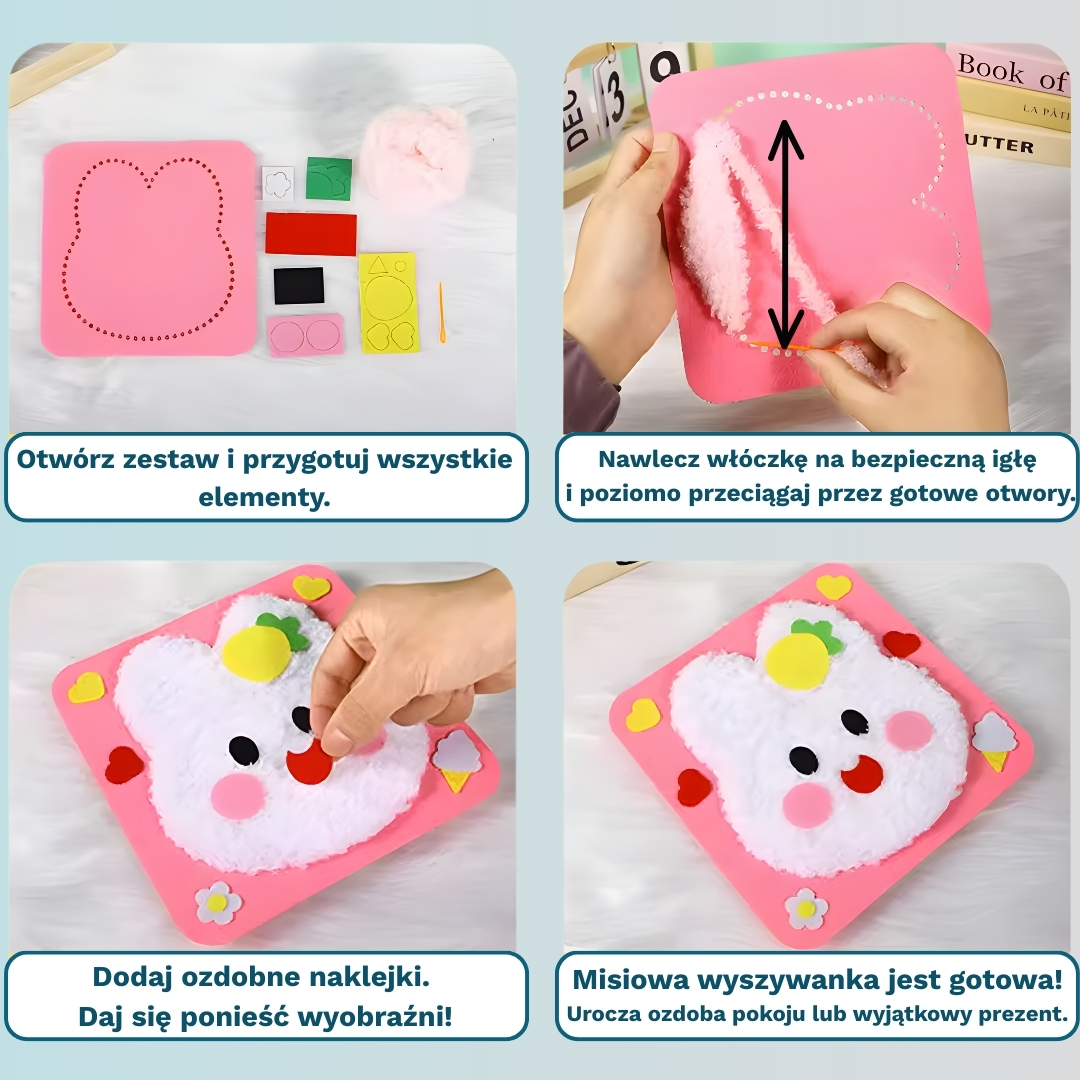 Wystarczy poziomo przeciągać włóczkę przez gotowe otwory, korzystając z bezpiecznej igły. Na koniec pozostaje dodać ozdobne naklejki i cieszyć się Misiową Wyszywanką.