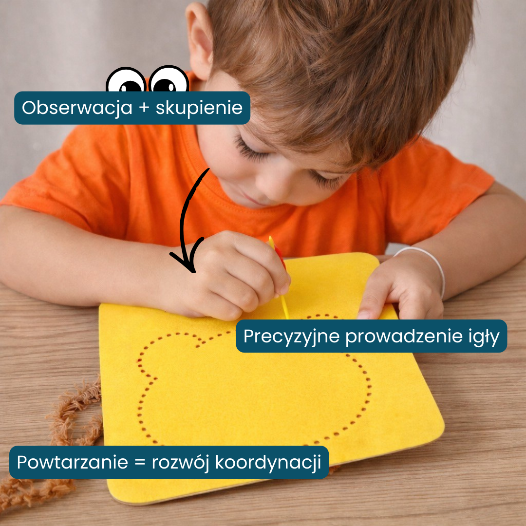 Przeciąganie włóczki przez konkretne otwory uczy dziecko skupienia i precyzyjnego kierowania ruchami dłoni. To ćwiczenie, które poprawia sprawność potrzebną zarówno w szkole, jak i w codziennych czynnościach.
